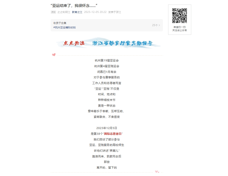 2023年12月5日,是第38个“国际志愿者日”,我们回访了部分参与亚运、亚残服务的高校师生,听他们讲述“弄潮儿”踏浪而来、凯歌而去后那些离开的,留下的——