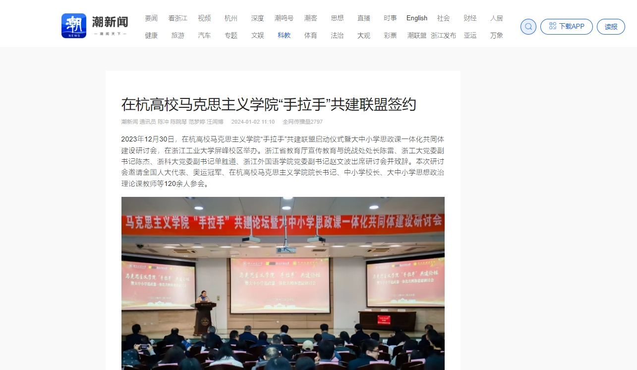 12月30日,在杭高校马克思主义学院“手拉手”共建联盟启动仪式暨大中小学思政课一体化共同体建设研讨会举行。会上,我校党委副书记单胜道和浙江工业大学党委副书记陈杰、浙江外国语学院党委副书记赵文波共同为“手拉手”共建马克思主义学院揭牌。三所高校马克思主义学院负责人共同签署了“手拉手”共建联盟协议,并为思想政治理论课实践导师颁发聘书。学习强国、潮新闻客户端等媒体对会议进行了报道。