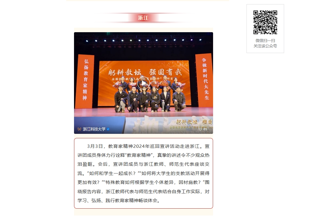 3月3日,教育家精神2024年巡回宣讲活动走进浙江。宣讲团成员身体力行诠释“教育家精神”,真挚的讲述令不少观众热泪盈眶。会后,宣讲团成员与浙江教师、师范生代表座谈交流。“如何和学生一起成长?”“如何将大学生的支教活动开展得更加有效?”“特殊教育如何根据学生个体差异,因材施教?”围绕报告内容,浙江教师代表与师范生代表结合自身工作实际,对学习、弘扬、践行教育家精神畅谈体会。