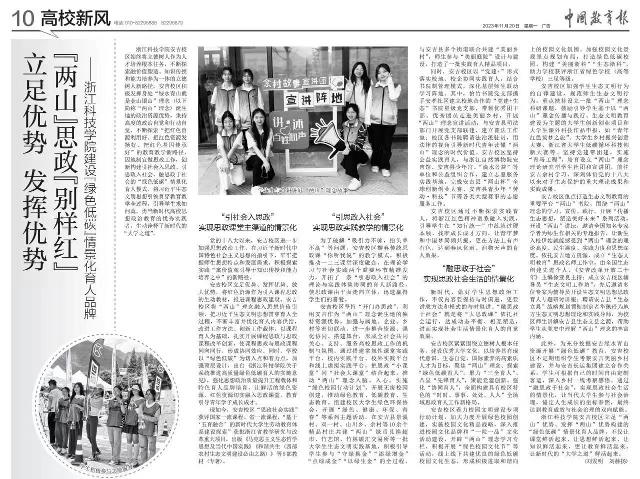 建设“两山”书院,举办“两山”讲坛,普及生态文明建设思想,学习、宣传和践行“两山”理念。实施“绿色校园行动计划”,开展无废校园建设,组建校区大学生绿色环保协会,组织学生志愿者利用周末和假期,在浙江省自然博物院安吉分院、安吉余村做义务讲解员,校区“引社会入思政、引思政入社会、融思政于社会”,打造绿色育人情景。