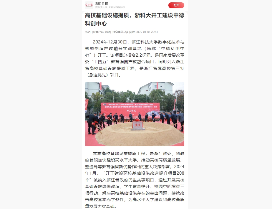 据悉,该项目总建筑面积近3万平方米,立足浙江省数字化技术和高端智能制造产业发展前沿,聚焦“数字化技术与智能制造”关键领域,依托学校国际化办学优势,构建打造中德合作产学研一体应用研发基地,深化产教融合、国际合作、校企合作,为浙江现代产业发展提供技术和人才支撑,助力浙江全球先进制造业基地建设。(光明日报全媒体记者 陆健)