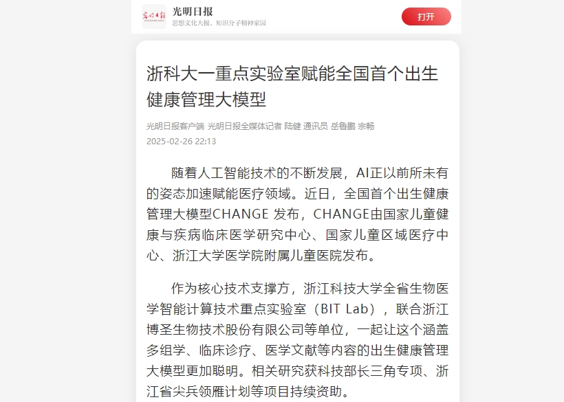 光明日报客户端:浙科大一重点实验室赋能全国首个出生健康管理大模型
