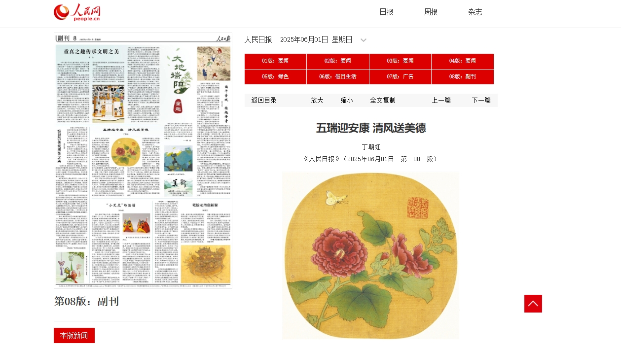 有时,端午花草还会与人物、动物进行组合,赋予扇面丰富内涵。宋代佚名《狸奴婴戏图》(又名《端午婴戏图》),巧妙将儿童形象、动物形象以及端午花草等融合进一页扇面,充满吉祥含义。