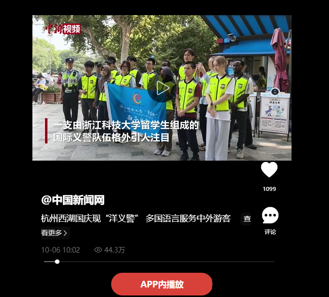 中国新闻网:杭州西湖国庆现“洋义警” 多国语言服务中外游客