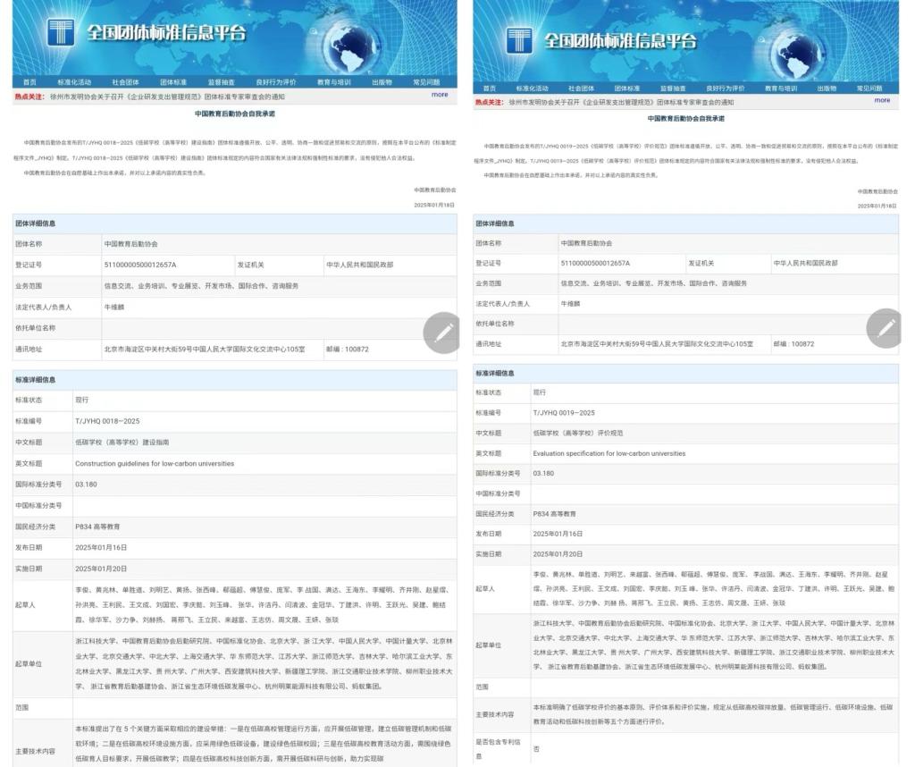 1月16日,经中国教育后勤协会批准,我校环资学院牵头编制的《低碳学校(高等学校)建设指南》(T/JYHQ 0018—2025)与《低碳学校(高等学校)评价规范》(T/JYHQ 0019—2025)团体标准正式发布,两项标准于2025年1月正式实施,填补了现行相关标准的空白。